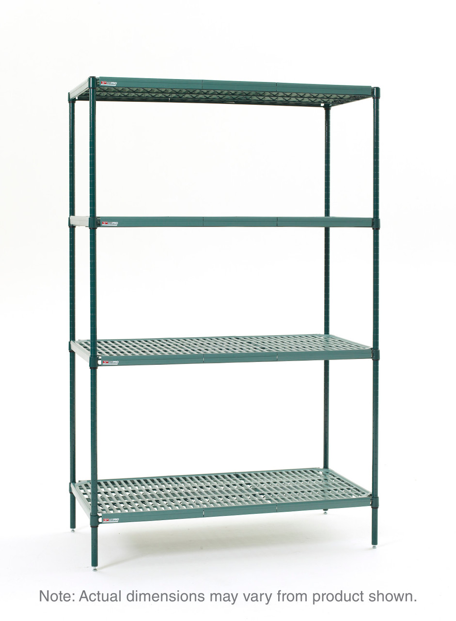 A complete shelving unit in a single box. Super Erecta Pro shelves features Metroseal Green epoxy coated Super Erecta-style frames with removable polymer shelf mats. Shelves can be repositioned at precise 1" (25mm) increments along the length of the numbered posts. Microban antimicrobial protection makes Super Erecta Pro shelving easier to clean and keeps it cleaner between cleanings.