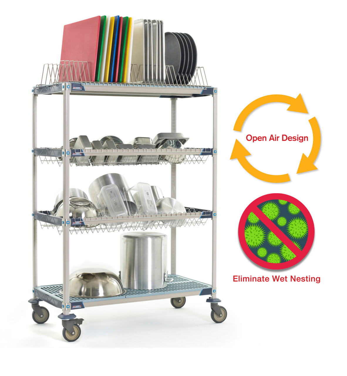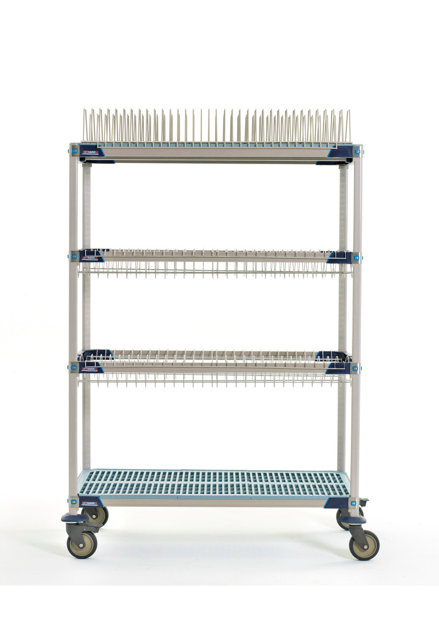 MetroMax i Drying Racks combine the corrosion protection and strength of MetroMax i with the convenience of a drying rack unit that efficiently sorts and holds pots, pans and trays while they dry to prevent wet nesting. Superior air circulation promotes fast drying of trays, cutting boards, pans, lids, pots and all sink items. Includes (2) MetroMax i shelf frames, (2) MetroMax i shelves, (2) stainless steel drop-in racks, (1) tray rack, (4) 63" (1600mm) mobile posts, and (4) corrosion resistant polymer horn casters (two swivel, two brake).