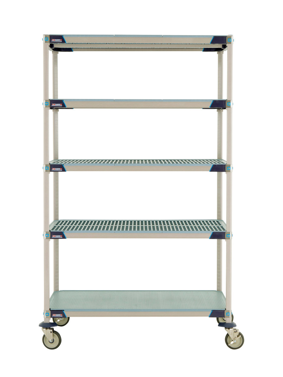 The strongest, most versatile, corrosion proof shelving system in the world. Removable polymer shelf mats for easy cleaning. Shelves can be positioned in 1" increments along the length of the post. Lifetime warranty against rust and corrosion. Posts and shelf mats include built-in Microban antimicrobial product protection to keep the product "cleaner between cleanings". Consists of 5 shelves (4 open grid, 1 MetroMax i solid), 74" posts, wedge connectors, and polyurethane casters.