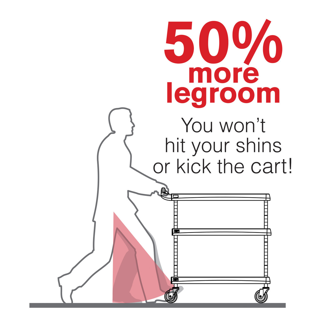 Additional legroom puts more distance between the shelves and you. This means you can push the cart more freely without hitting your shins and feet.