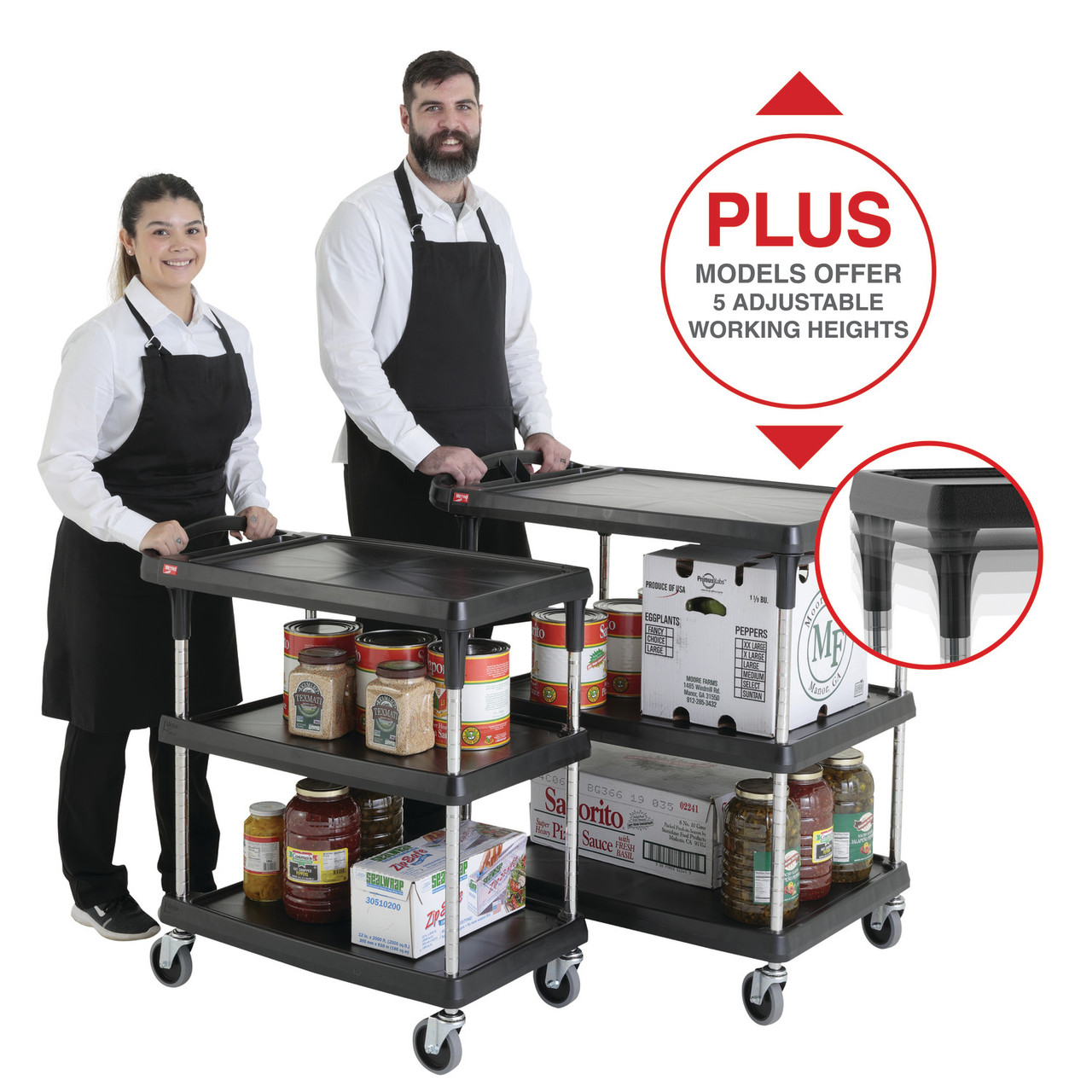 myCart Plus models offer 5 heights for better ergonomics, more undershelf storage and adjusts to meet other shelves or work surfaces.