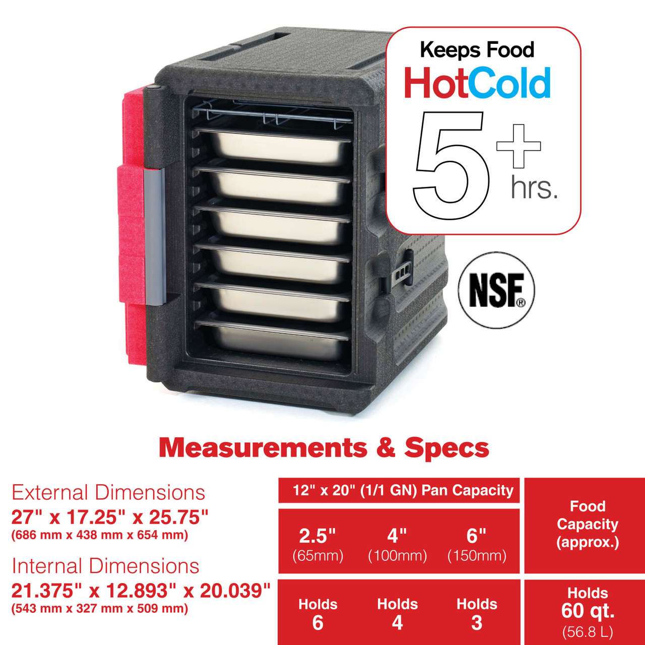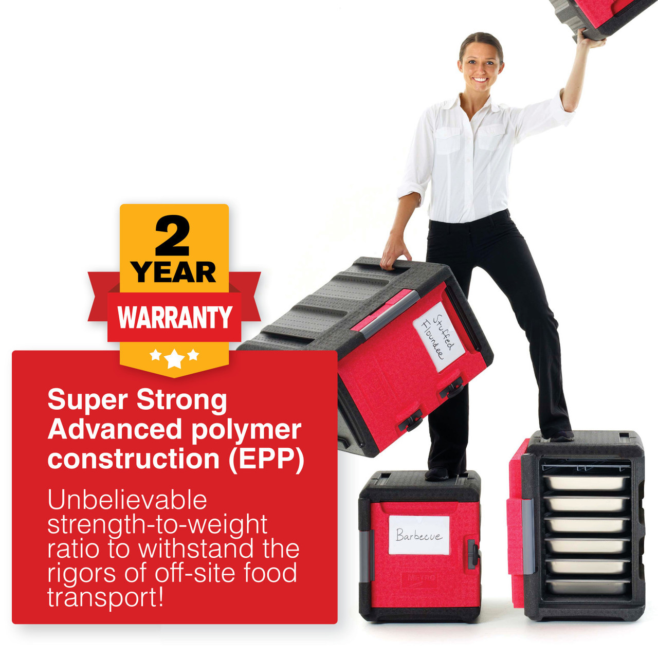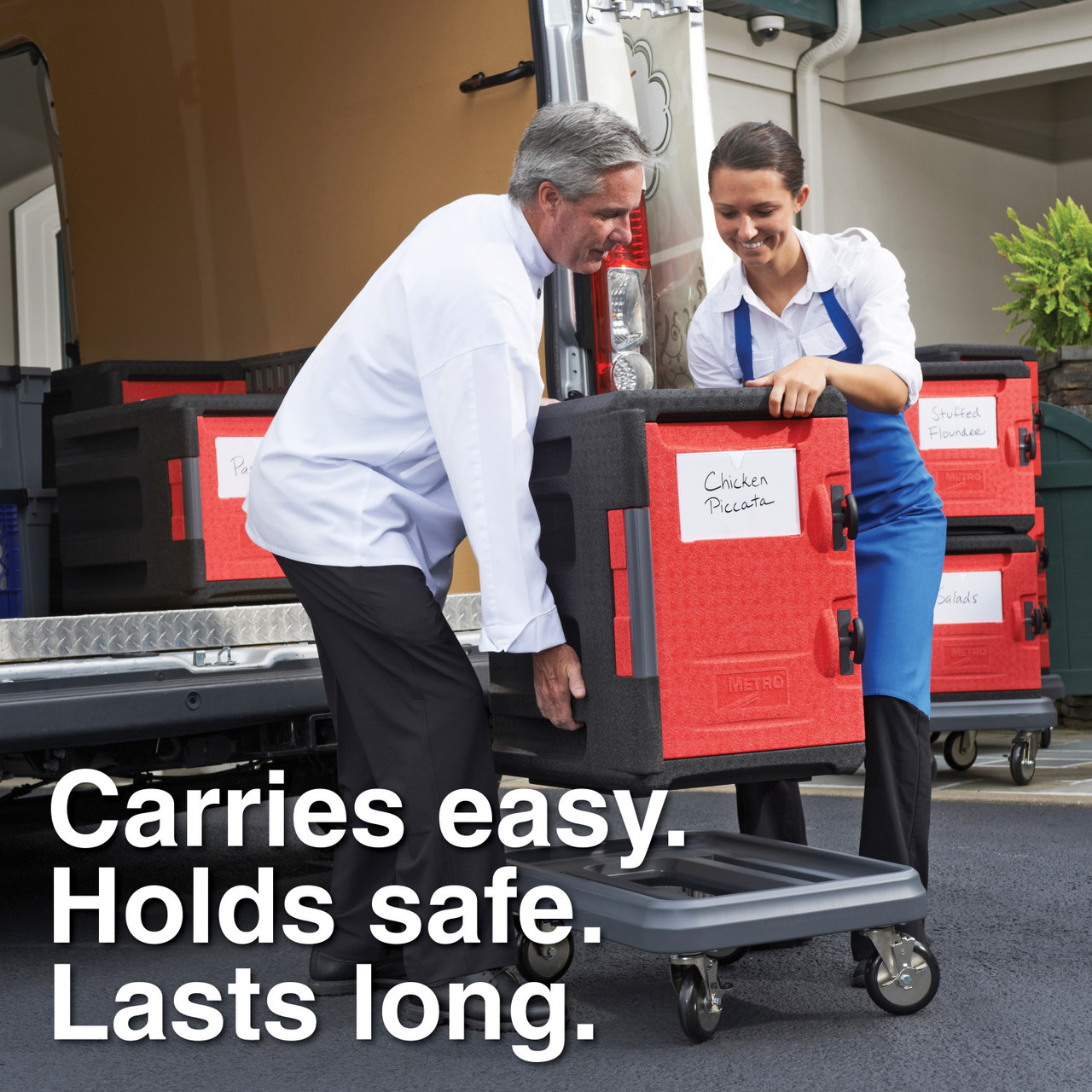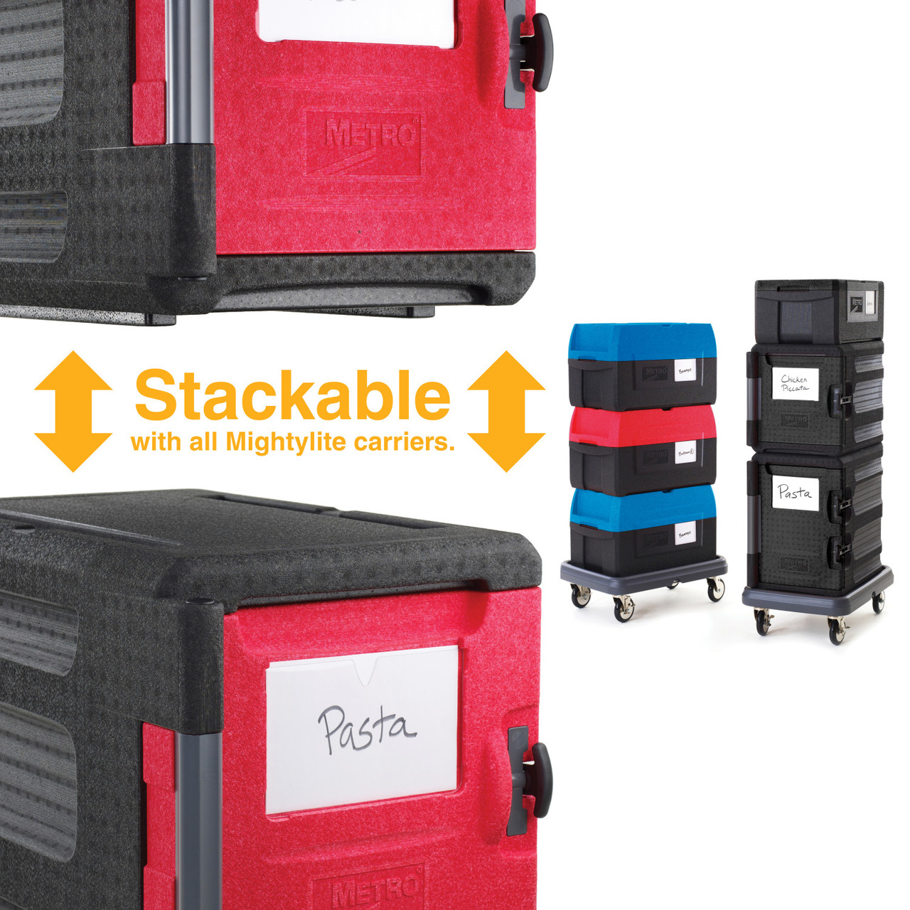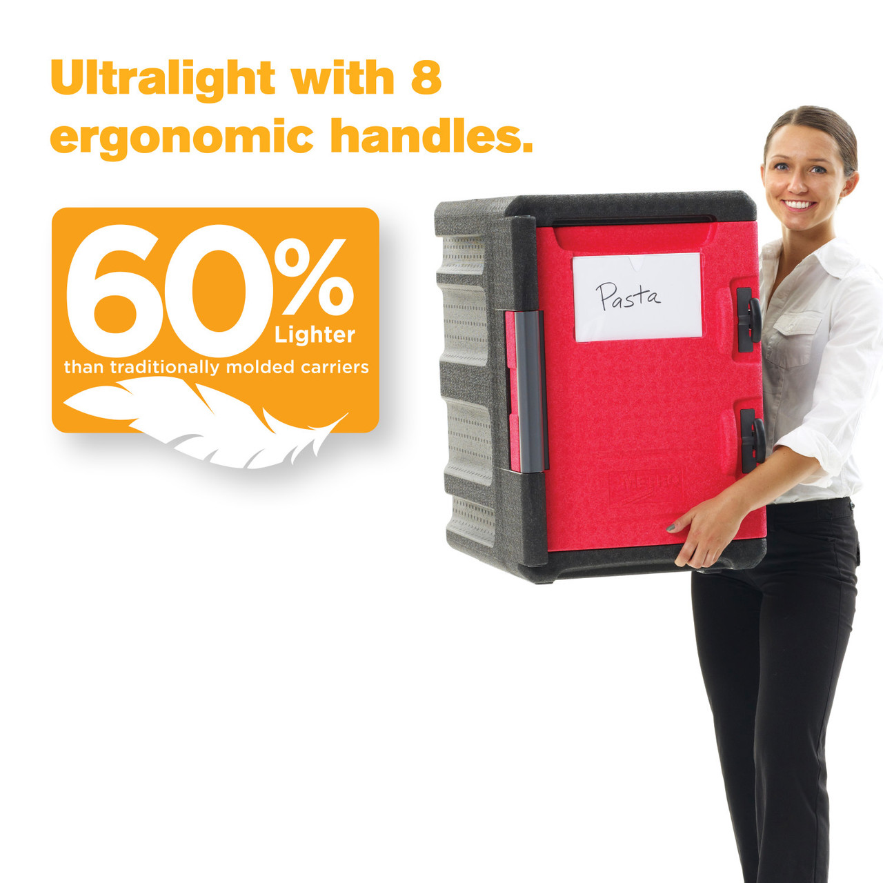 Attractive, ultralight, and durable insulated front-load pan carrier for transporting and delivering hot and cold 12x20/GN food pans to off-site locations. ML400 holds approximately 60 quarts for food. Keep food safe for 5+ hours. Advanced polymer foam construction with high strength-to-weight ratio withstands impact without damage. Weighs 60% less than traditional polymer molded, urethane foam-filled carriers. Eight convenient, ergonomically-friendly, integrated handles provide the ultimate flexibility to facilitate lifting, carrying, and moving in various situations. Includes complimentary wire caddy to help organize and hold common temperature maintenance tools and other odd shaped items such as quart containers.