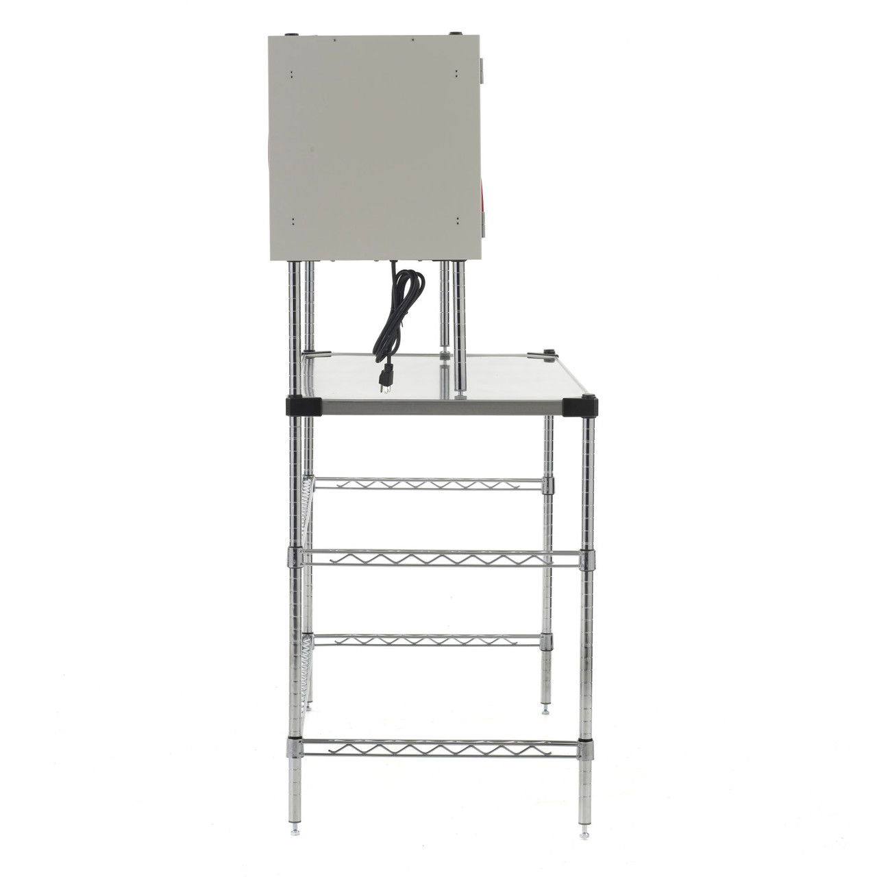 Available in 36” and 48” lengths, Super Erecta Hot Workstations with an Enclosed Super Erecta Hot Heated Shelf include a 24” deep stainless steel work surface, one Super Erecta Hot Heated Shelf Enclosure kit, two chrome 3-sided frames, and chrome Super Erecta SiteSelect posts.