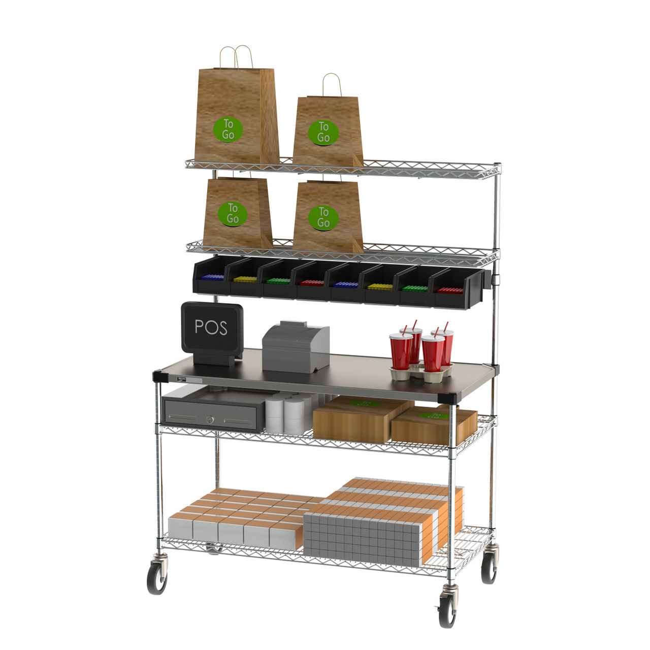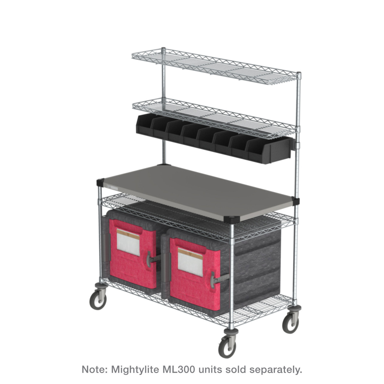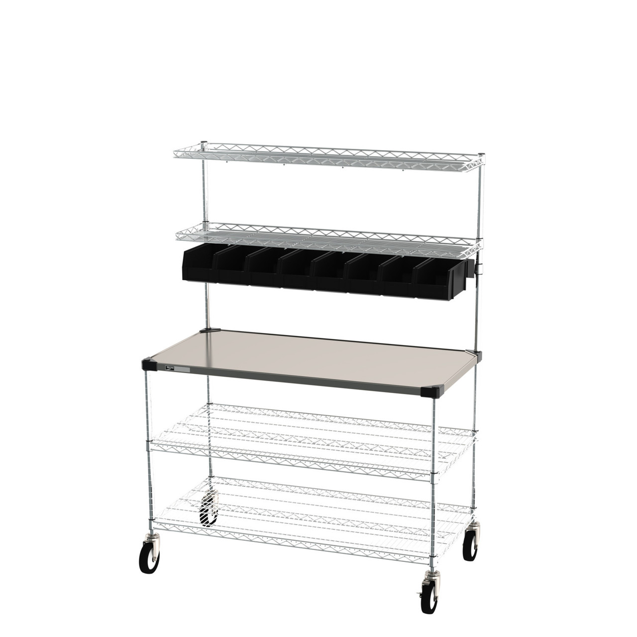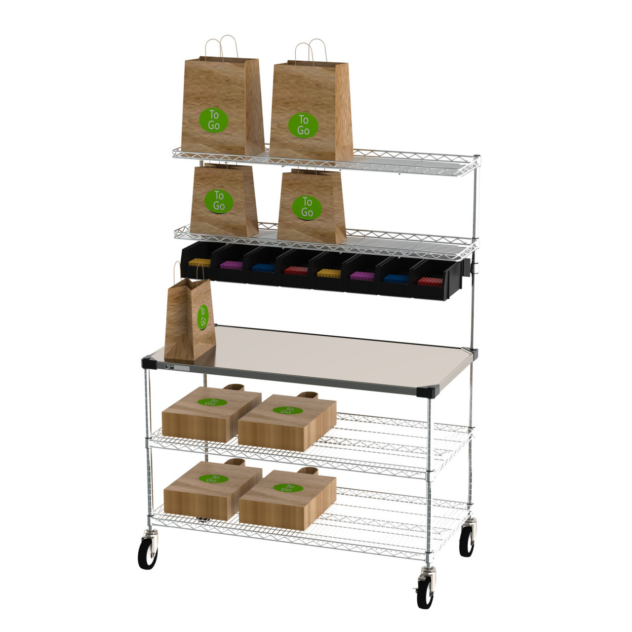 The Metro Delivery-Staging and Drive-Thru Wire Shelving Workstation comes complete with a worktable, overhead storage system, and an additional shelving area below the worksurface. It comes in two sizes, 24” x 30” and 24” x 48”. Designed with efficiency in mind, each unit comes with a bin storage system to keep condiments and utensils within an arm's reach. Each worktable has a solid stainless steel composition to ensure strength and durability with everyday use and cleaning. Overhead storage offers a place to stage orders after completion. The added storage space below the unit ensures that all supplies are kept within an easy-to-reach distance without having to leave the area.