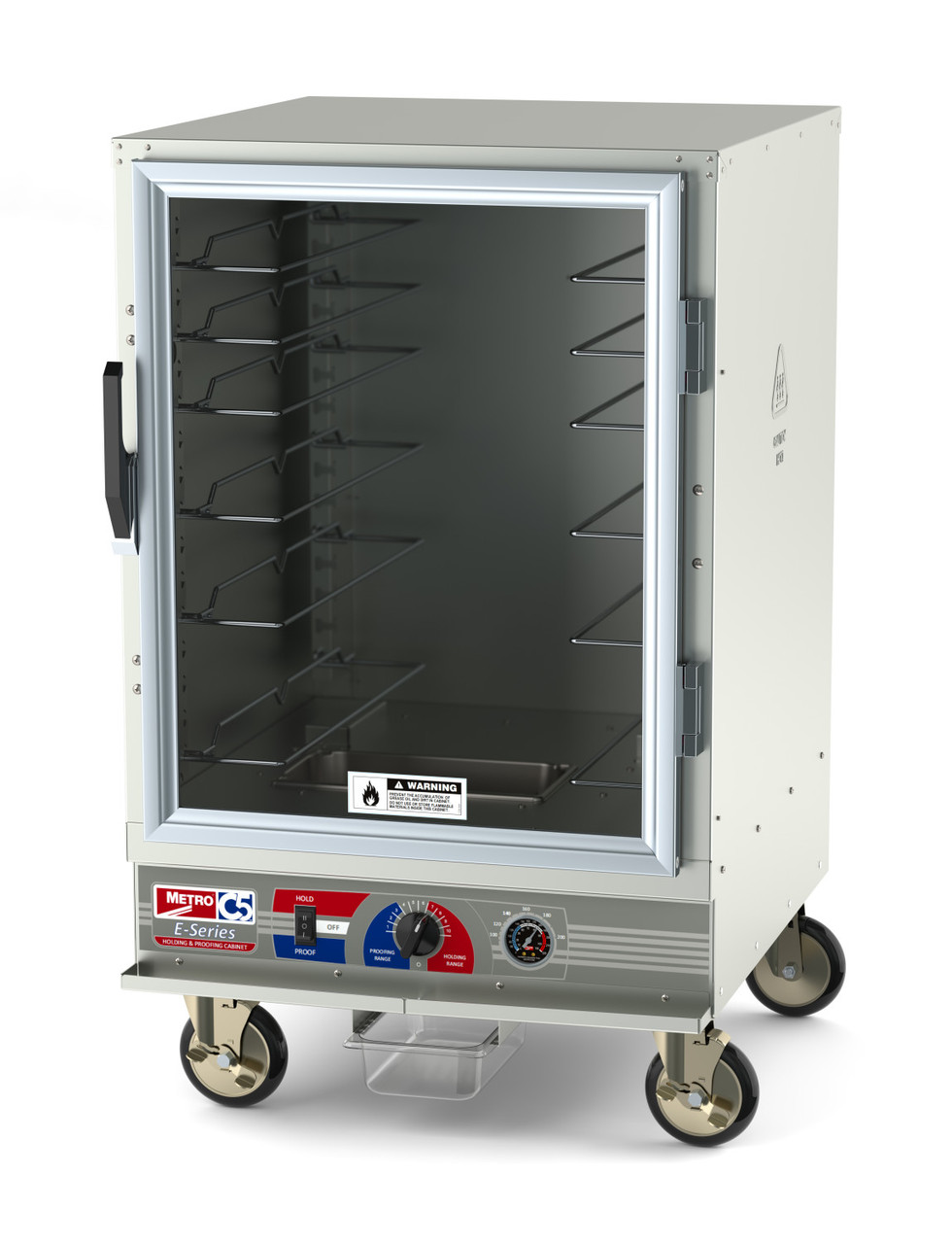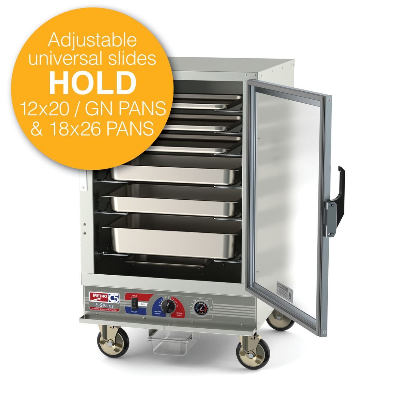 Get the right essentials, and the reliability of a trusted brand. Metro’s value driven C5 E-Series design provides the right mix of features to economically hold & proof in the same cabinet. Universal slides accommodate a variety of pans and higher power output assures food stays hot, safe, and appetizing. C5 E-Series is a winning combination of the best features, the right price, and top-quality construction. This half height cabinet includes 6 pairs of universal pan slides.