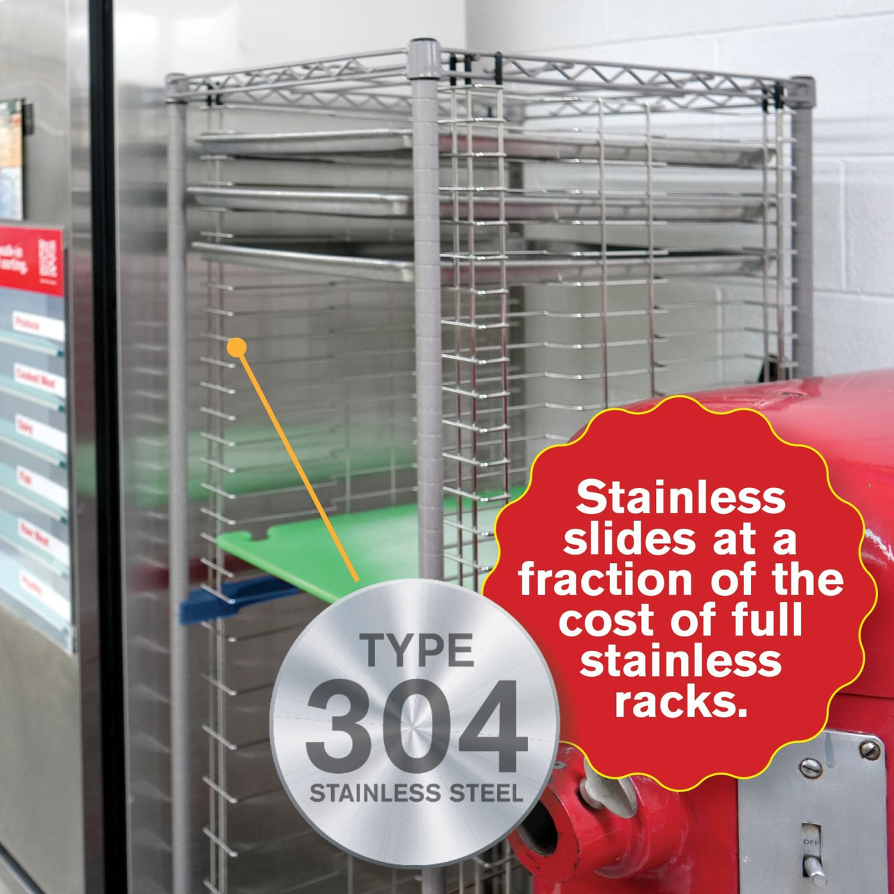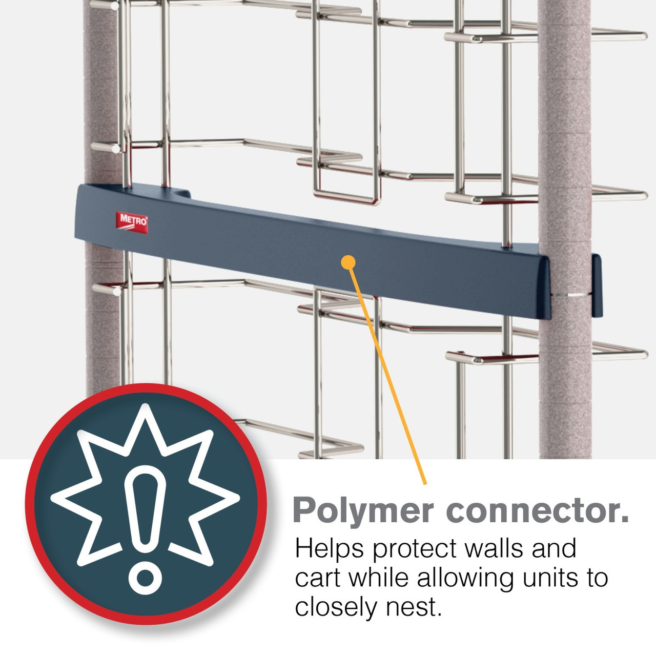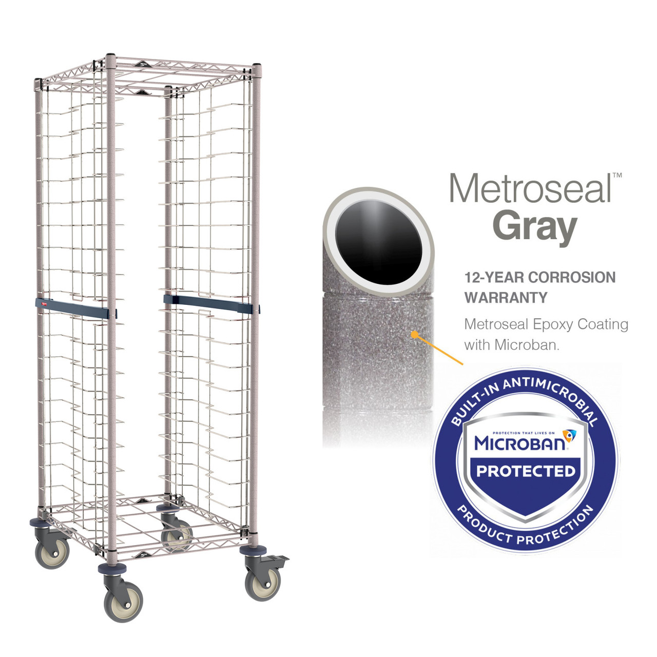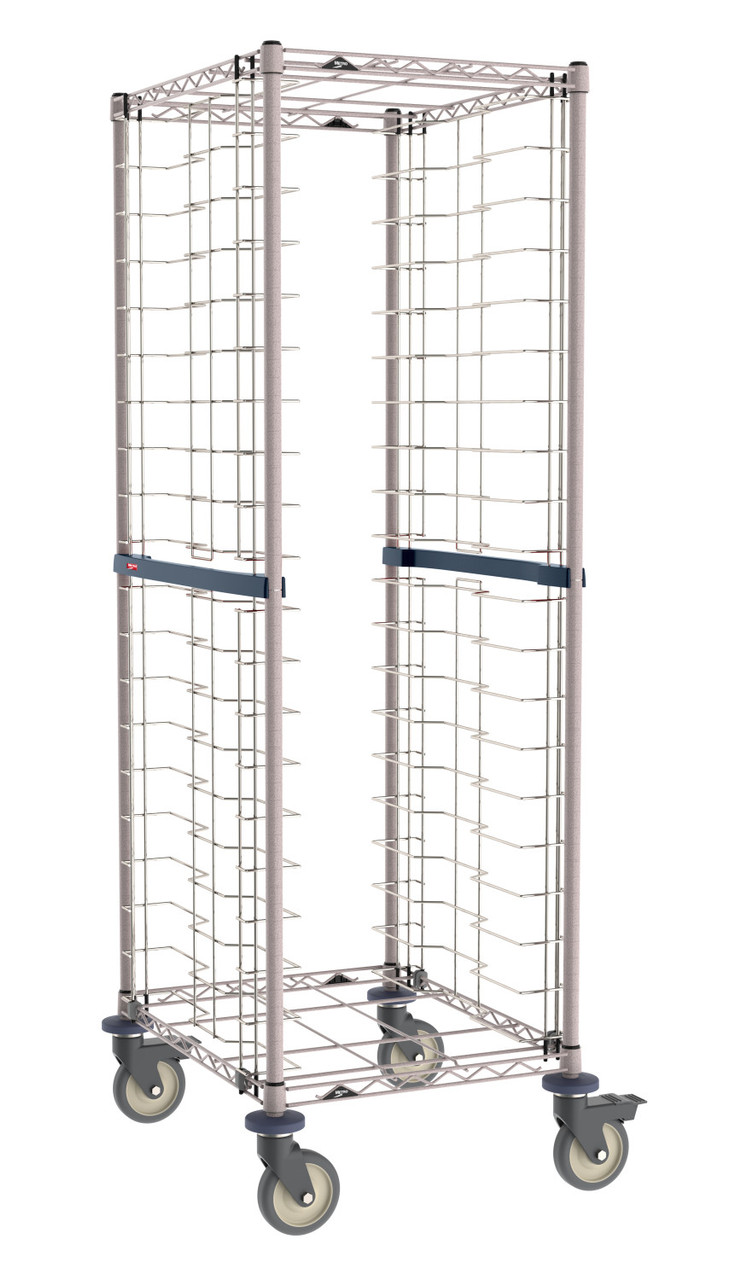 Metro Super Erecta Stainless Steel/Metroseal Pan Racks offer stainless steel wire slides with Metroseal Gray epoxy structure for the perfect balance of performance and affordability. The polymer post connector helps protect walls and the rack while allowing units to closely nest. End-load models provide a large tray landing area. Choice of 1.5" spacing (40 pans) or 3" spacing (20 pans). Quick, easy no-tool assembly. Weight load capacity of 30 lbs. per level and 200 lbs. per rack.