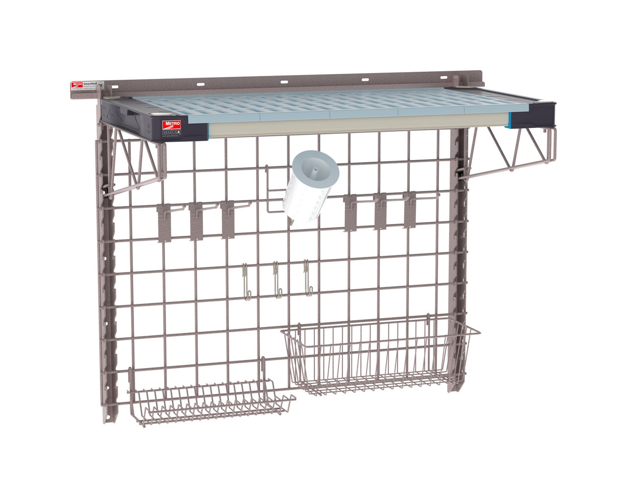 This 1-shelf configuration includes a MetroMax 4 plastic shelf with removable mats and Microban antimicrobial protection to help maintain a cleaner surface. The Metroseal Gray wall grid and included accessories maximize organization by keeping cleaning tools within easy reach. Designed to free up counter space and improve workflow, the SmartWall system helps facilities take advantage of underutilized wall space.