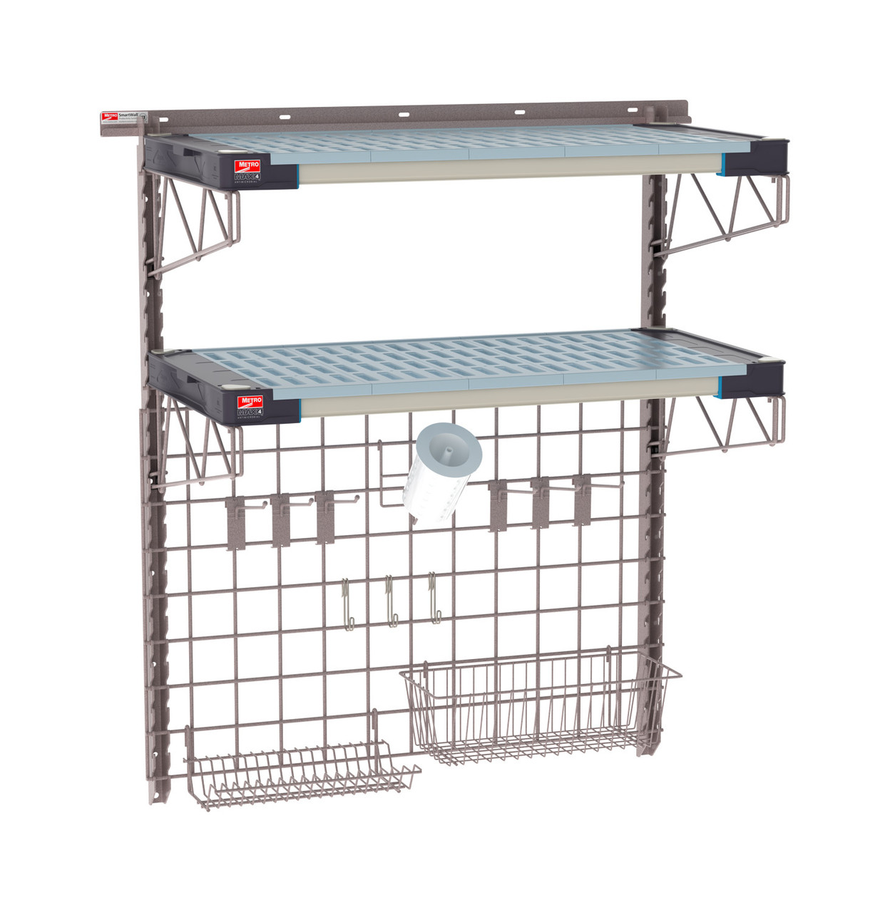 This 2-shelf configuration includes two MetroMax 4 plastic shelves with removable grid mats and Microban antimicrobial protection to help maintain a cleaner surface between cleanings. The Metroseal Gray wall grid and included accessories maximize organization by keeping cleaning tools within easy reach. Designed to free up counter space and improve workflow, the SmartWall system helps facilities take advantage of underutilized wall space.