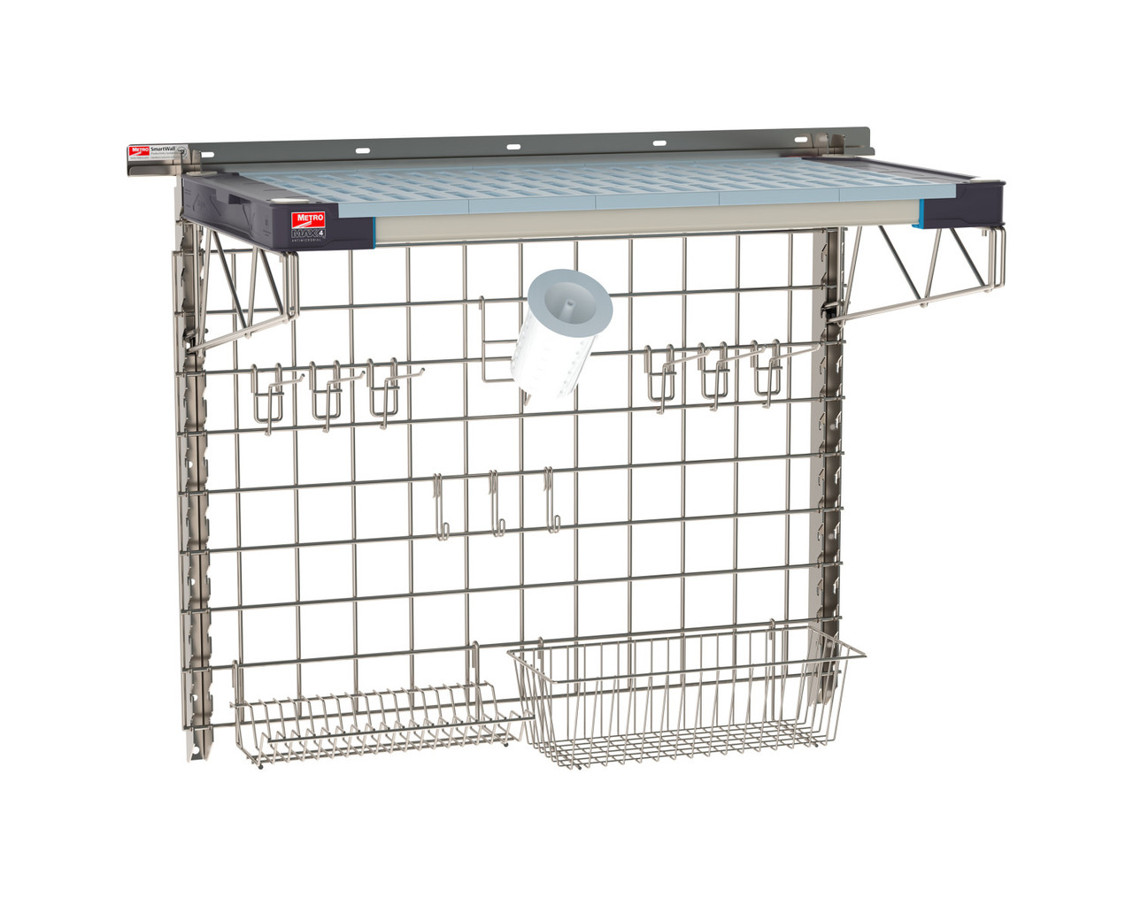 This 1-shelf configuration includes a MetroMax 4 plastic shelf with removable mats and Microban antimicrobial protection to help maintain a cleaner surface. The 304 stainless steel wall grid and included accessories maximize organization by keeping cleaning tools within easy reach. Designed to free up counter space and improve workflow, the SmartWall Life wall shelving system helps facilities take advantage of underutilized wall space.