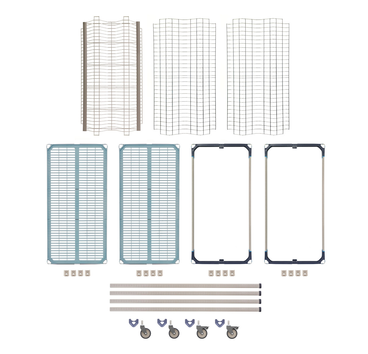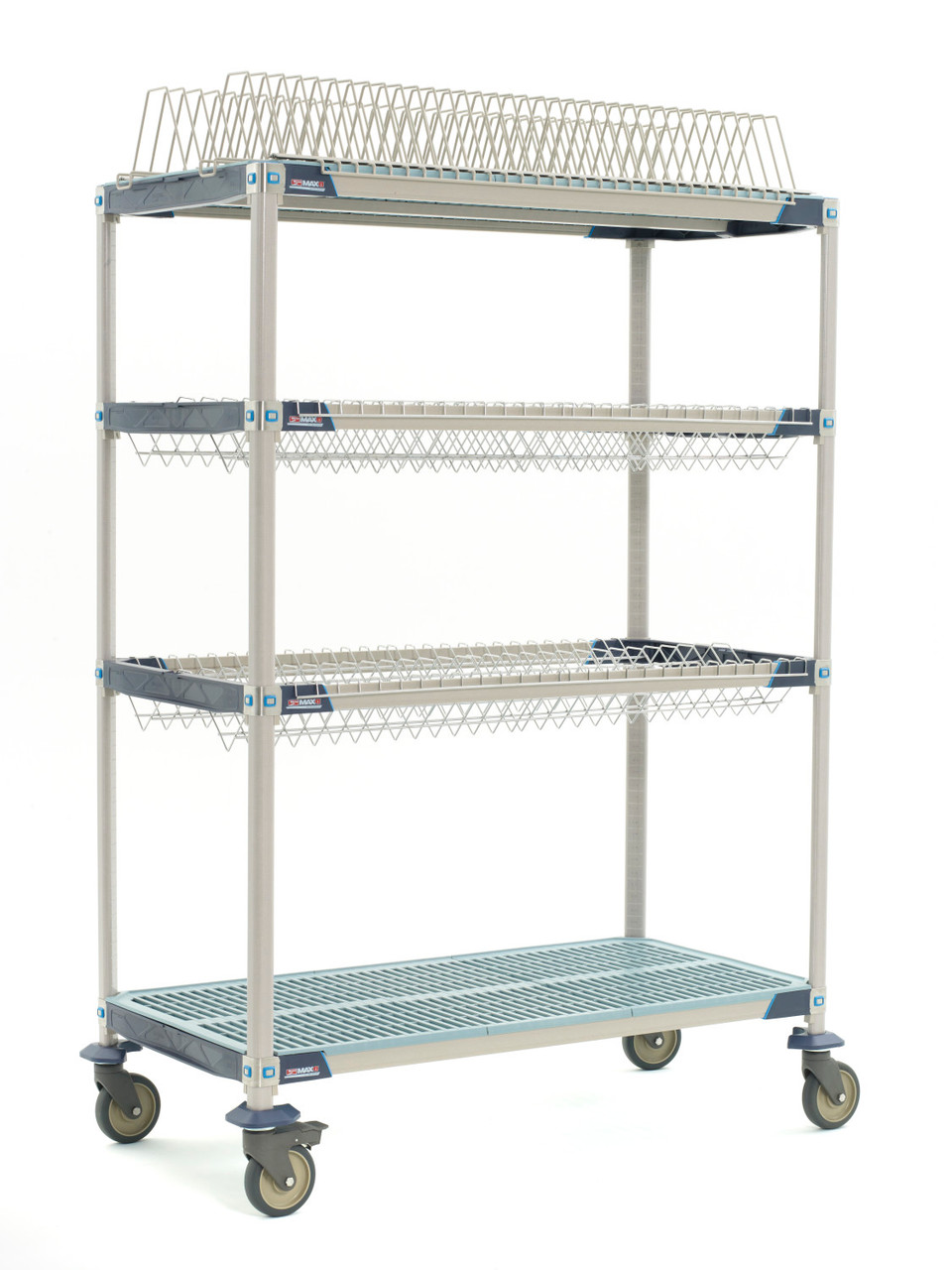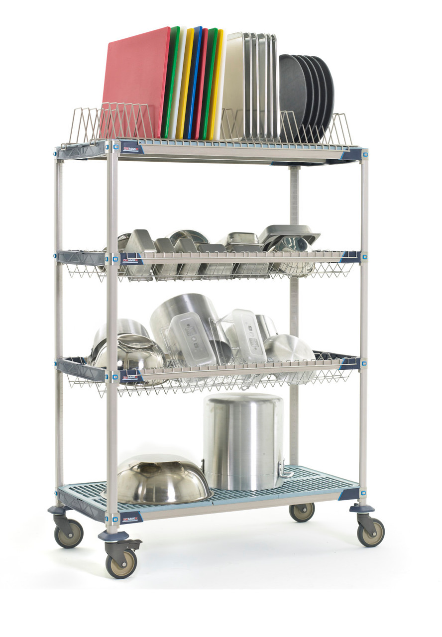 MetroMax i Drying Racks combine the corrosion protection and strength of MetroMax i with the convenience of a drying rack unit that efficiently sorts and holds pots, pans and trays while they dry to prevent wet nesting. Superior air circulation promotes fast drying of trays, cutting boards, pans, lids, pots and all sink items. Includes (2) MetroMax i shelf frames, (2) MetroMax i shelves, (2) stainless steel drop-in racks, (1) tray rack, (4) 63" (1600mm) mobile posts, and (4) corrosion resistant polymer horn casters (two swivel, two brake).