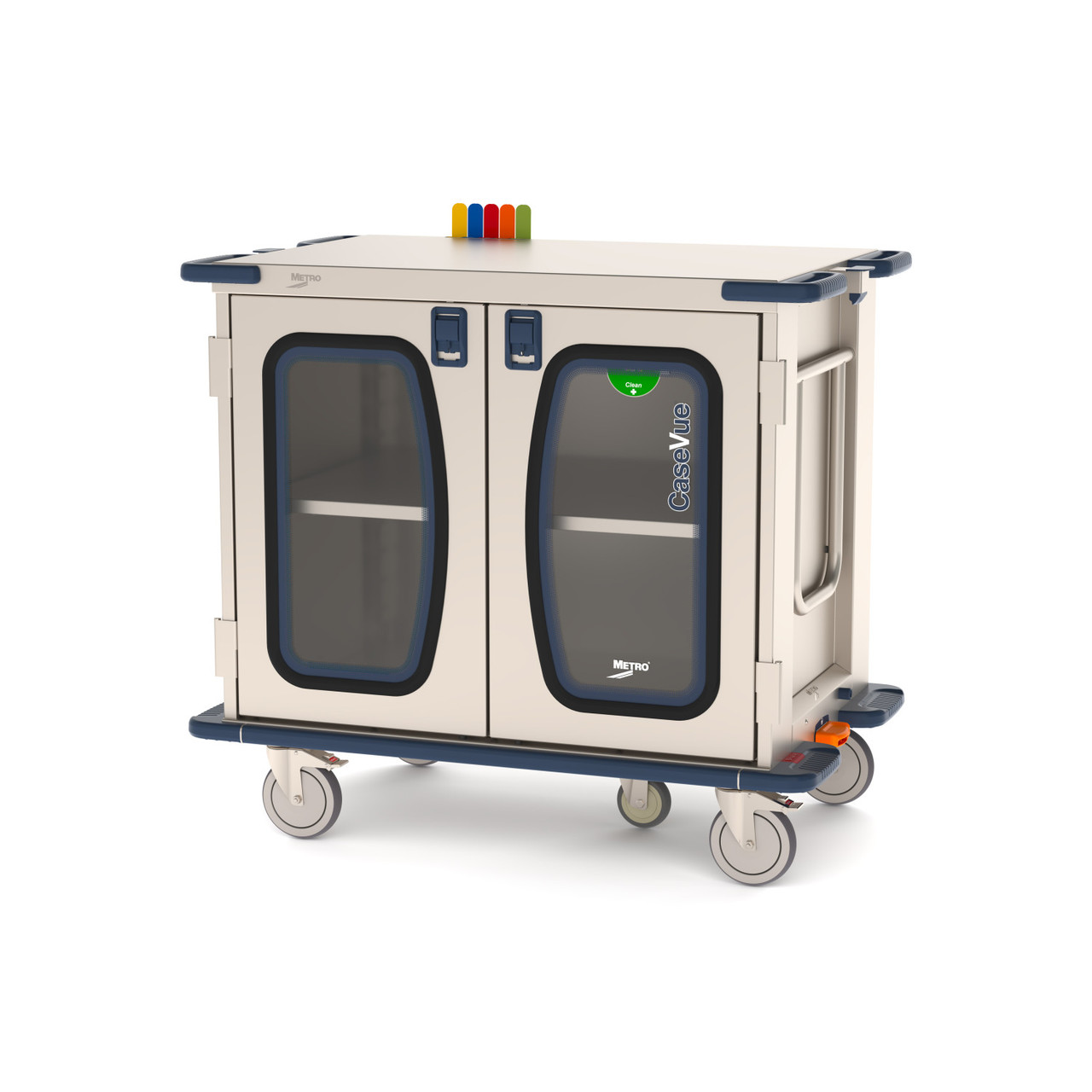 Built for easy transport, Metro CaseVue is stronger, lighter, and the most ergonomic surgical case cart available. Carts can be used wherever contents must be protected from an “unclean” environment, including hospital based or offsite surgery centers. Low 36 CaseVue models with clear doors feature all stainless steel construction, polycarbonate clear windows sealed with rubber gasket, cool touch wide grip handles, stainless steel casters, security door latch, picklist/paper holder, door catch, and rotating biohazard indicator wheel to identify cart contents as Biohazard or Clean. Options such as 5th wheel steering assist and a swing-up extended handle assure maximum control during transit. Pullout roller shelves are available in stainless steel wire or solid options. Optional Color Status Flags are also available to provide a quick view of a cart’s status at any time.