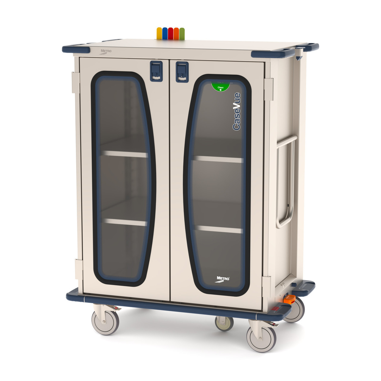 Built for easy transport, Metro CaseVue is stronger, lighter, and the most ergonomic surgical case cart available. Carts can be used wherever contents must be protected from an “unclean” environment, including hospital based or offsite surgery centers. High 36 CaseVue models with clear doors feature all stainless steel construction, polycarbonate clear windows sealed with rubber gasket, cool touch wide grip handles, stainless steel casters, security door latch, picklist/paper holder, door catch, swing-up extended handle, and rotating biohazard indicator wheel to identify cart contents as Biohazard or Clean. Optional 5th wheel steering assist assures maximum control in transit. Pullout roller shelves are available in stainless steel wire or solid options. Optional Color Status Flags are also available to provide a quick view of a cart’s status at any time.