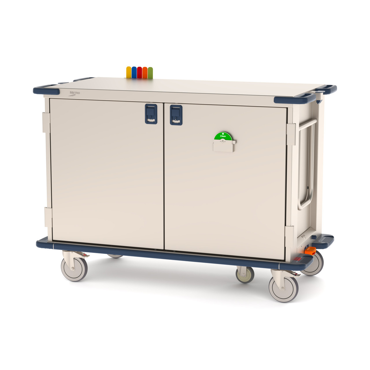 Built for easy transport, Metro CaseVue is stronger, lighter, and the most ergonomic surgical case cart available. Carts can be used wherever contents must be protected from an “unclean” environment, including hospital based or offsite surgery centers. Low 48 CaseVue models with solid doors feature all stainless steel construction, cool touch wide grip handles, stainless steel casters, security door latch, picklist/paper holder, door catch, and rotating biohazard indicator wheel to identify cart contents as Biohazard or Clean. Options such as 5th wheel steering assist and a swing-up extended handle assure maximum control during transit. Pullout roller shelves are available in stainless steel wire or solid options. Optional Color Status Flags are also available to provide a quick view of a cart’s status at any time.