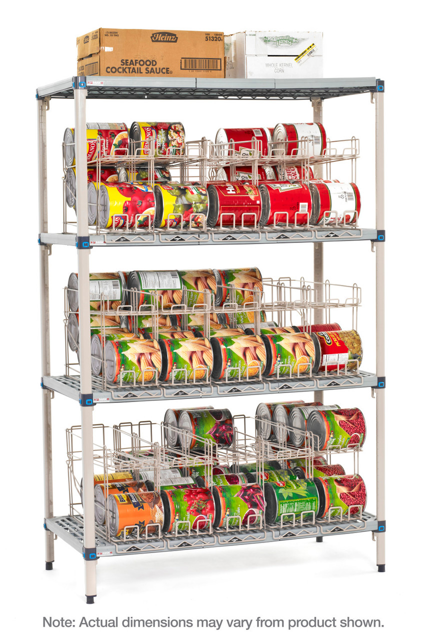 Rust-resistant MetroMax Q unit with can rack accessories allows for heavy-duty large can storage. Each can rack holds 8 #10 cans or 12 #5 cans. 4-shelf units feature bulk storage capabilities on the top shelf. Corrosion resistant shelves and posts offer a 25-year warranty against rust and corrosion. Polymer mats are easily removable and cleanable in sinks or commercial washers. Patented corner release allows shelves to be adjusted without tools. Simply flip each corner release, relocate the wedge connectors on the posts, and reposition the shelf. Microban Antimicrobial Product Protection is built into the shelf mats, frames, and posts to inhibit the growth of bacteria, mold, mildew, and fungus that cause odors and product degradation. Microban product protection keeps the product "cleaner between cleanings." NSF Listed for all environments.