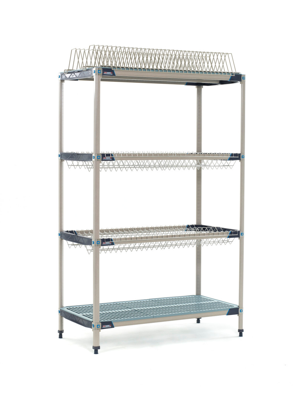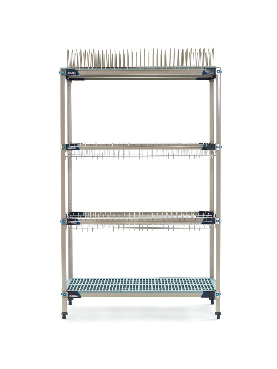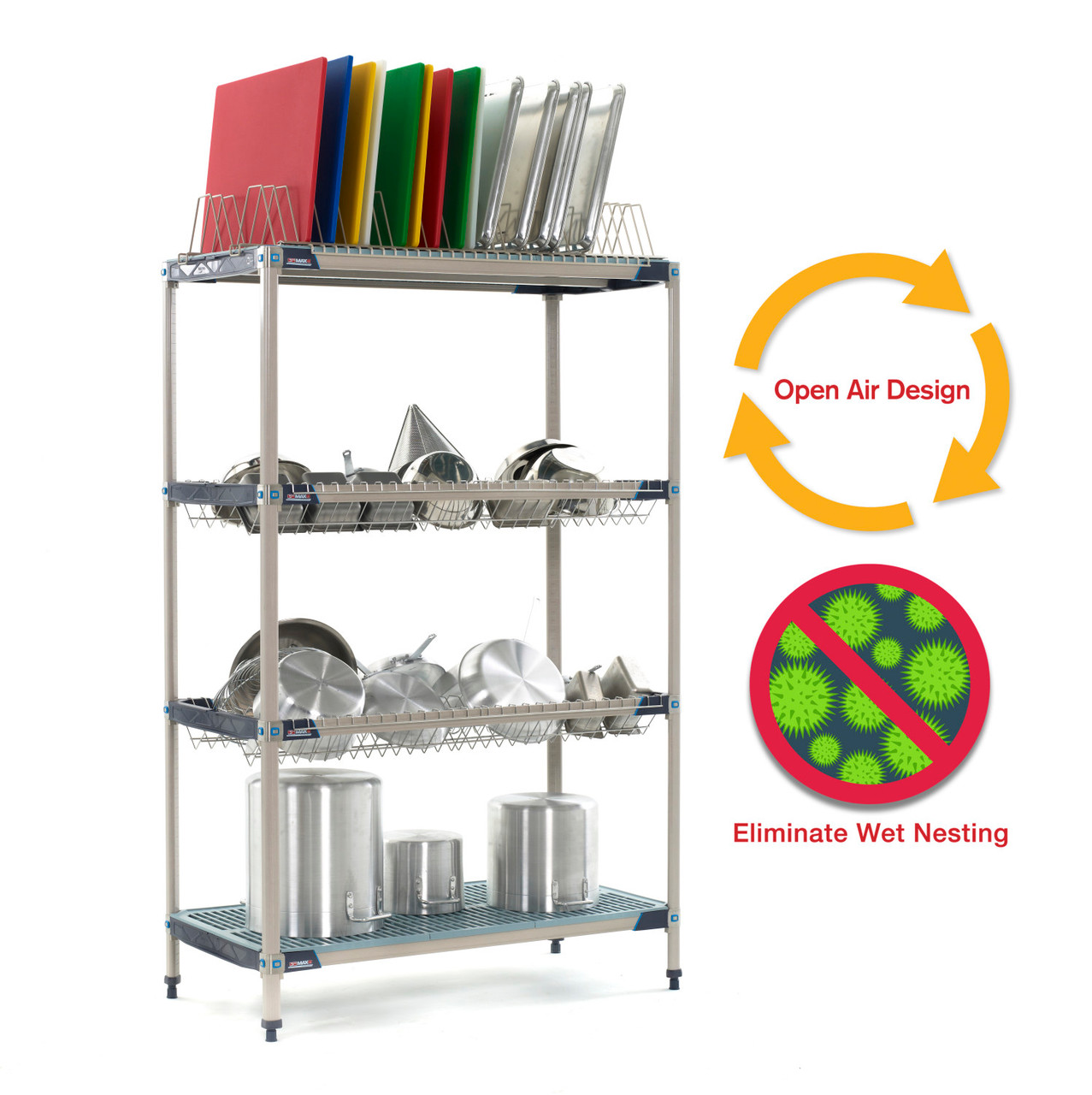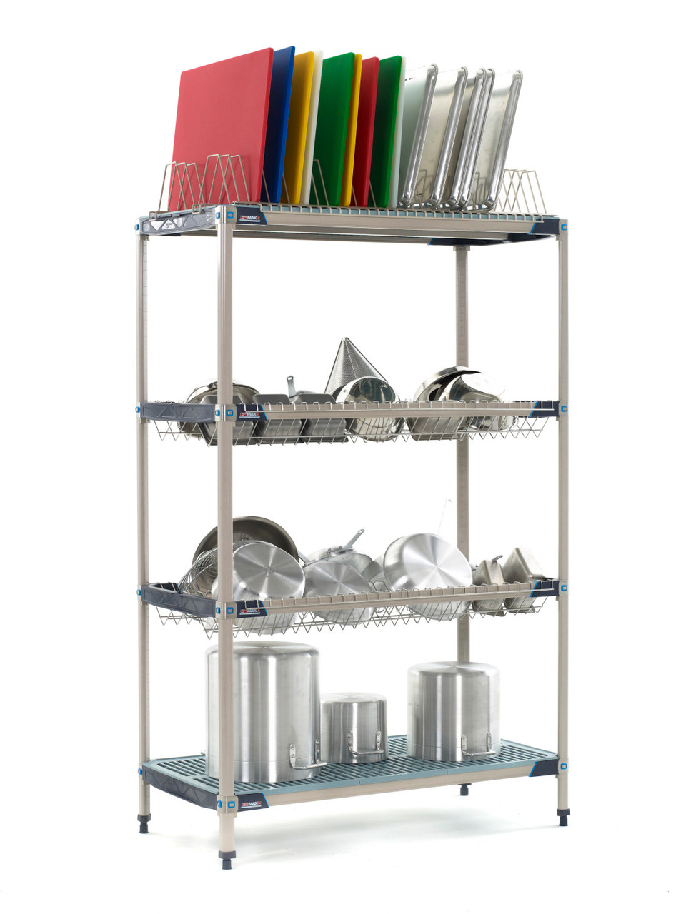 MetroMax i Drying Racks combine the corrosion protection and strength of MetroMax i with the convenience of a drying rack unit that efficiently sorts and holds pots, pans and trays while they dry to prevent wet nesting. Superior air circulation promotes fast drying of trays, cutting boards, pans, lids, pots and all sink items. Includes (2) MetroMax i shelf frames, (2) MetroMax i shelves, (2) stainless steel drop-in racks, (1) tray rack, and (4) 74” (1880mm) posts with leveling feet.