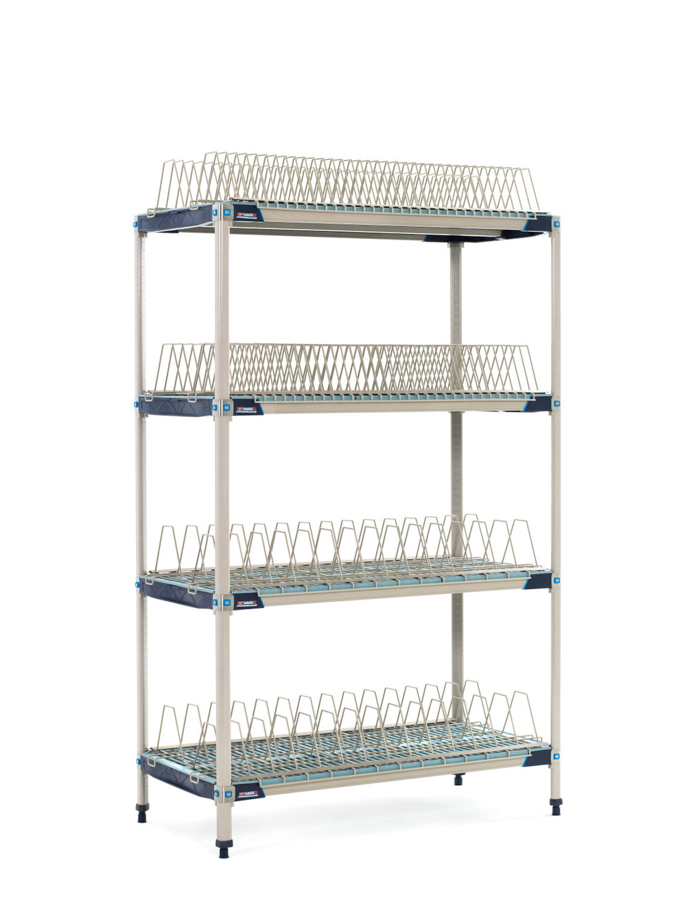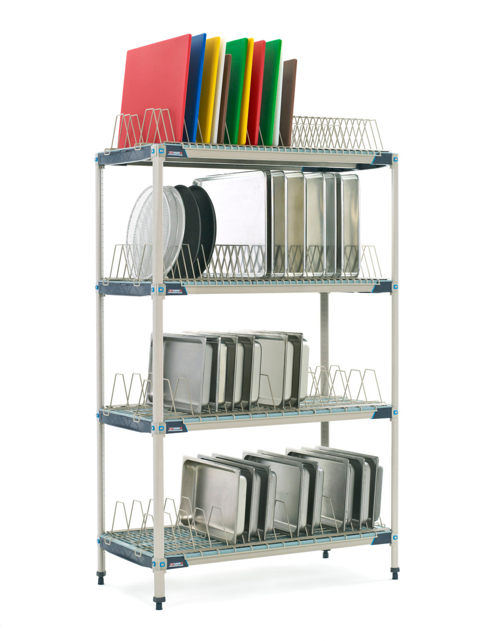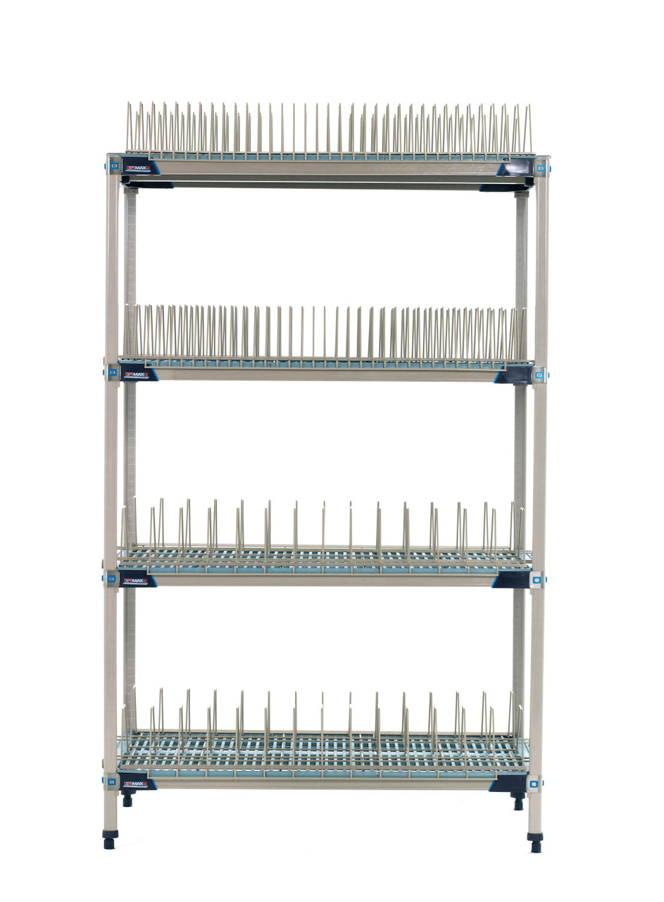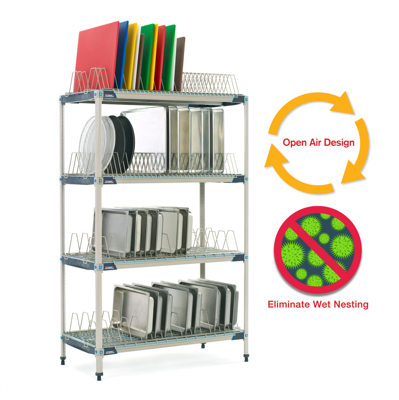 MetroMax i Drying Racks combine the corrosion protection and strength of MetroMax i with the convenience of a drying rack unit that efficiently sorts and holds pots, pans and trays while they dry to prevent wet nesting. Superior air circulation promotes fast drying of trays, cutting boards, pans, lids, pots and all sink items. Includes (4) MetroMax i shelves, (2) tray racks, (2) steam pan racks, and (4) 74” (1880mm) posts with leveling feet.